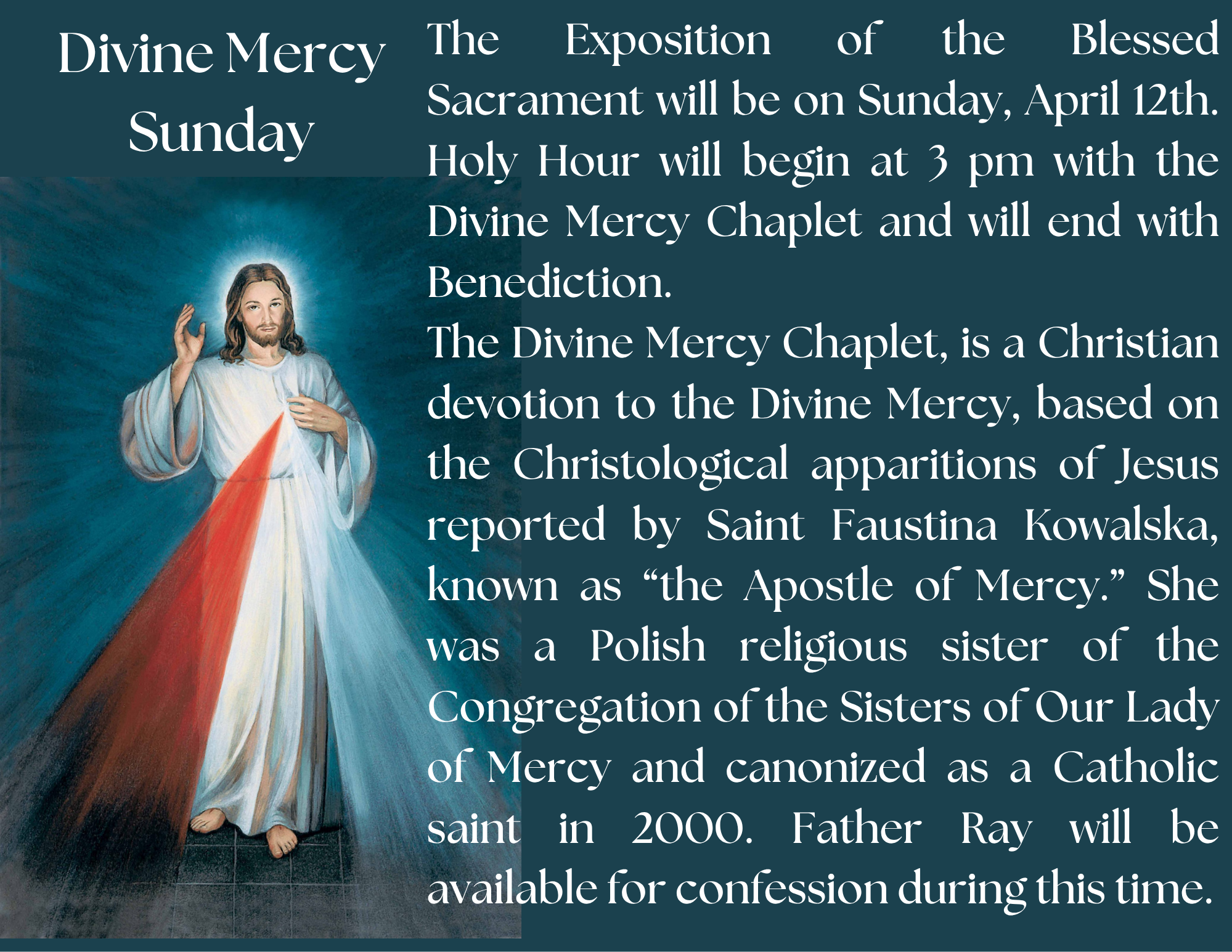 - Saturday evening Confessions from 3:30 p.m. until 4:30 p.m. in the Church Confessionals