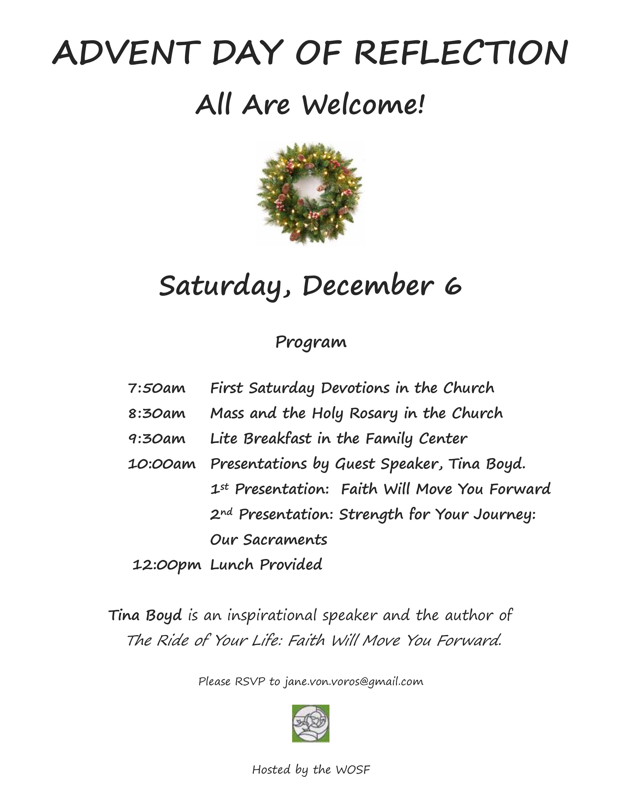 - Saturday evening Confessions from 3:30 p.m. until 4:30 p.m. in the Church Confessionals