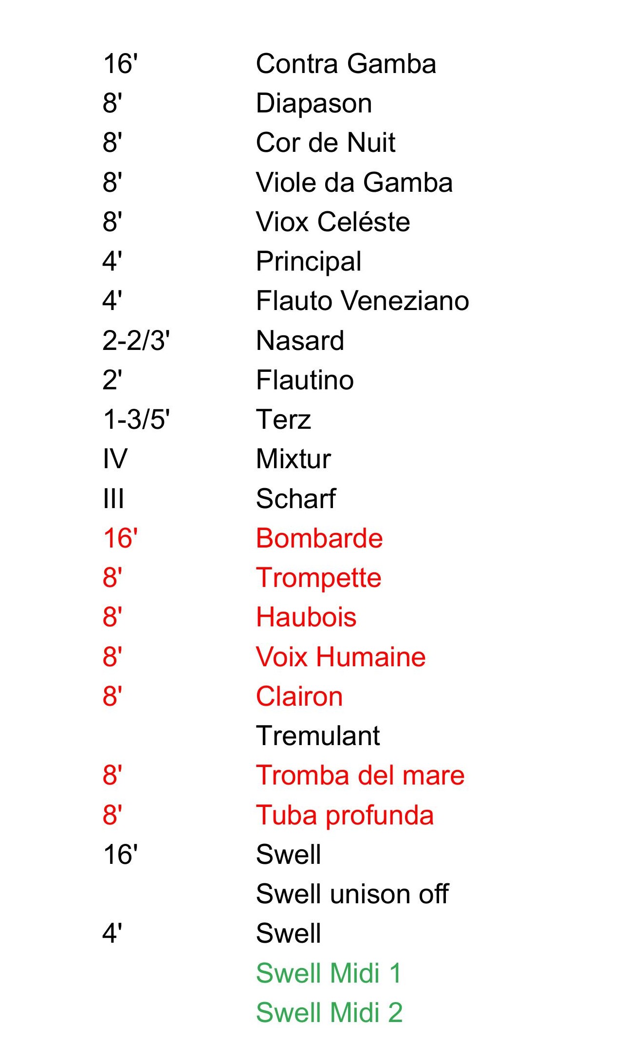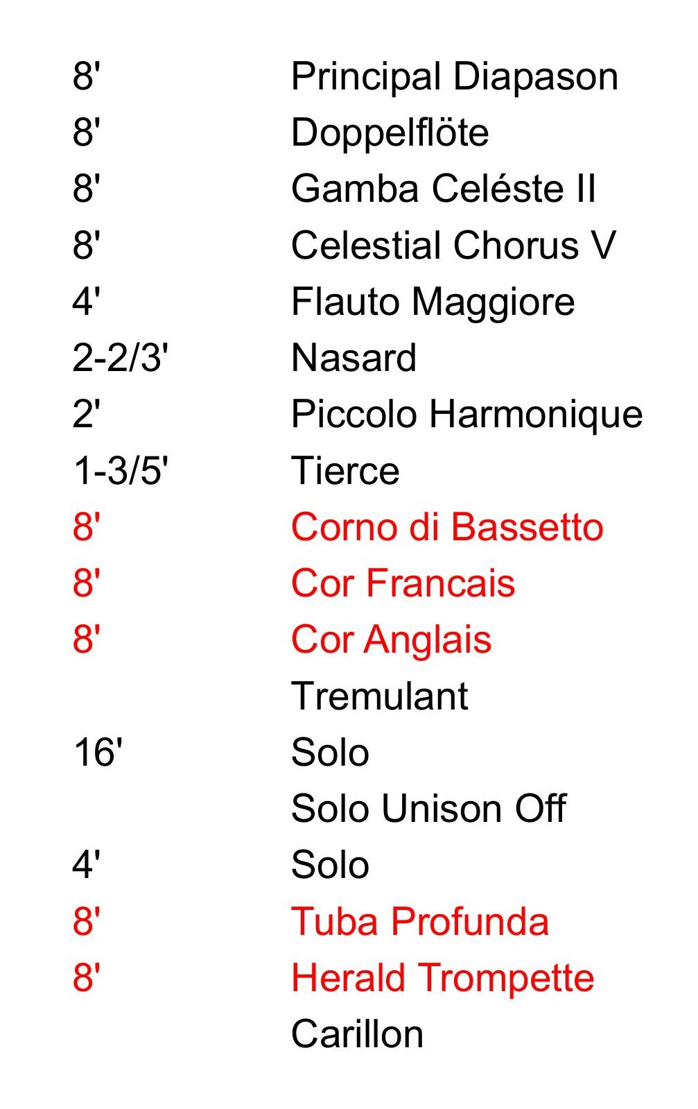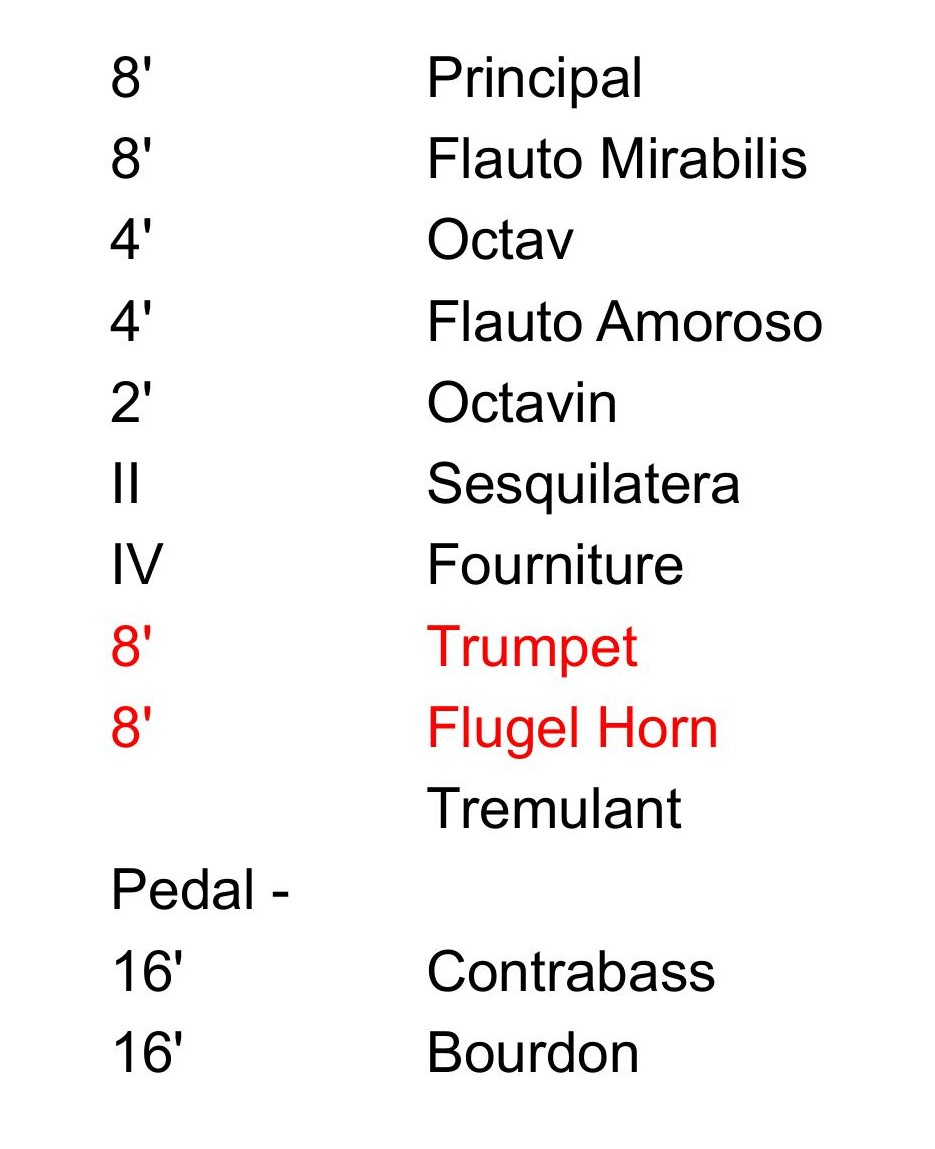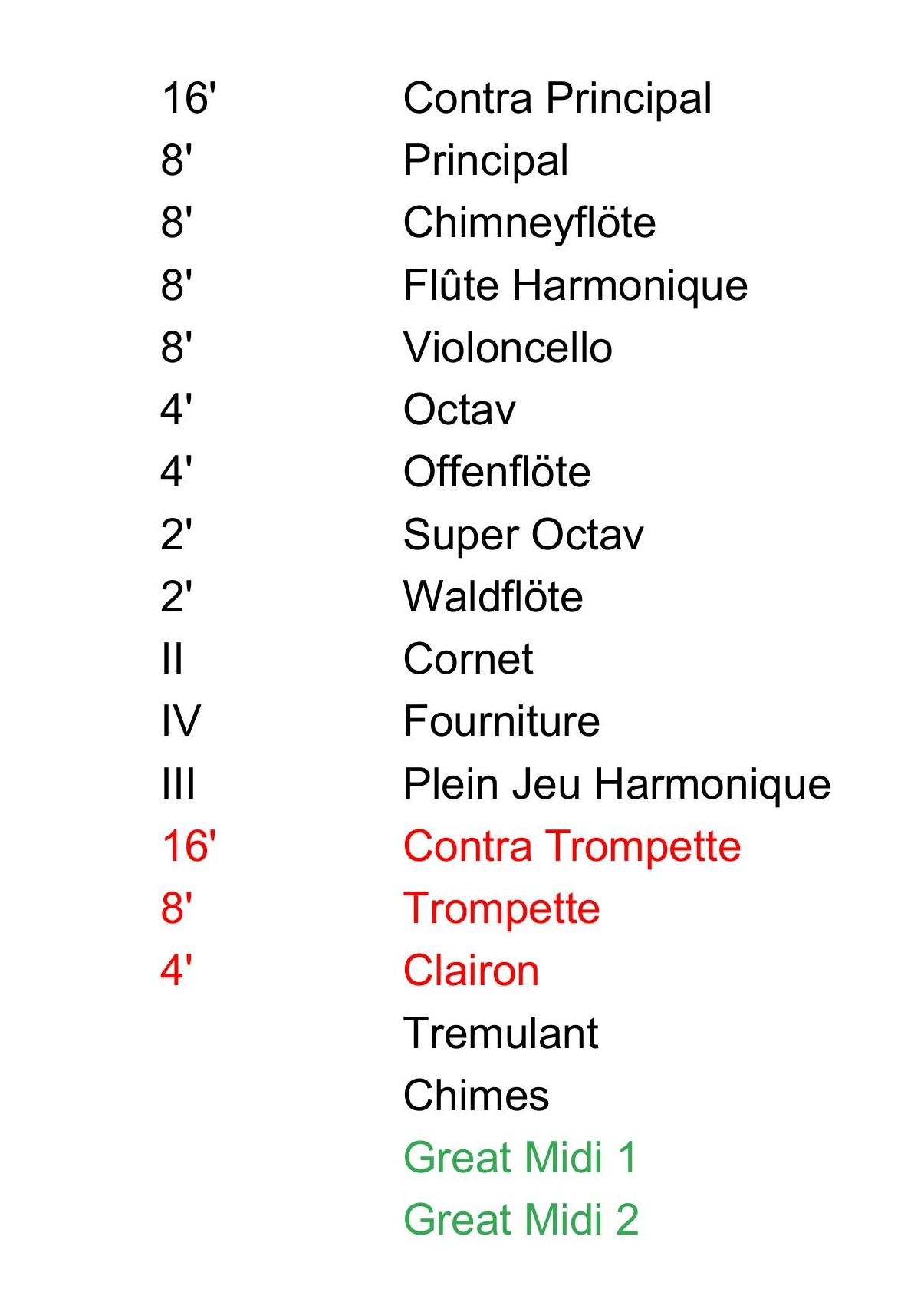 Solo – The Solo Division consists of large-scale voices that will sound from the ceiling above the sanctuary, where the current digital organ is presently heard. It will contain several distinctive solo reeds.