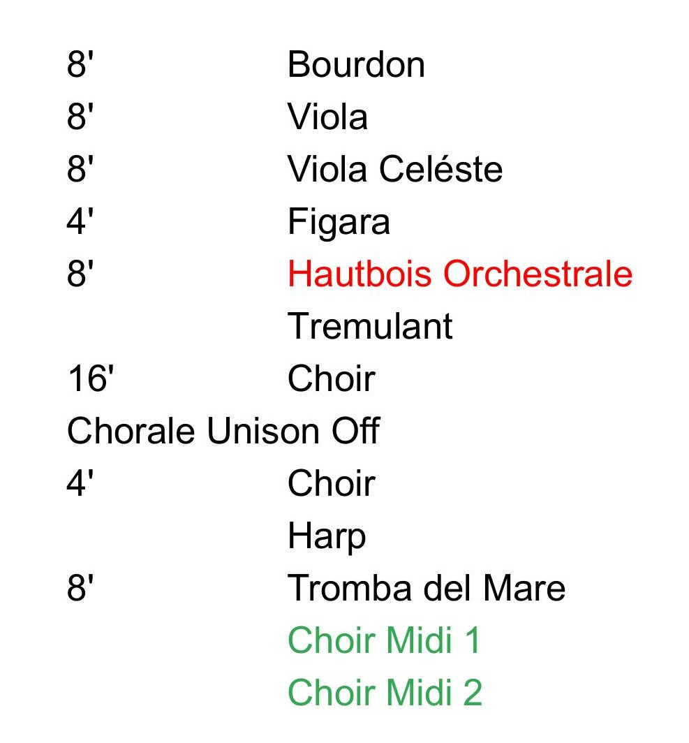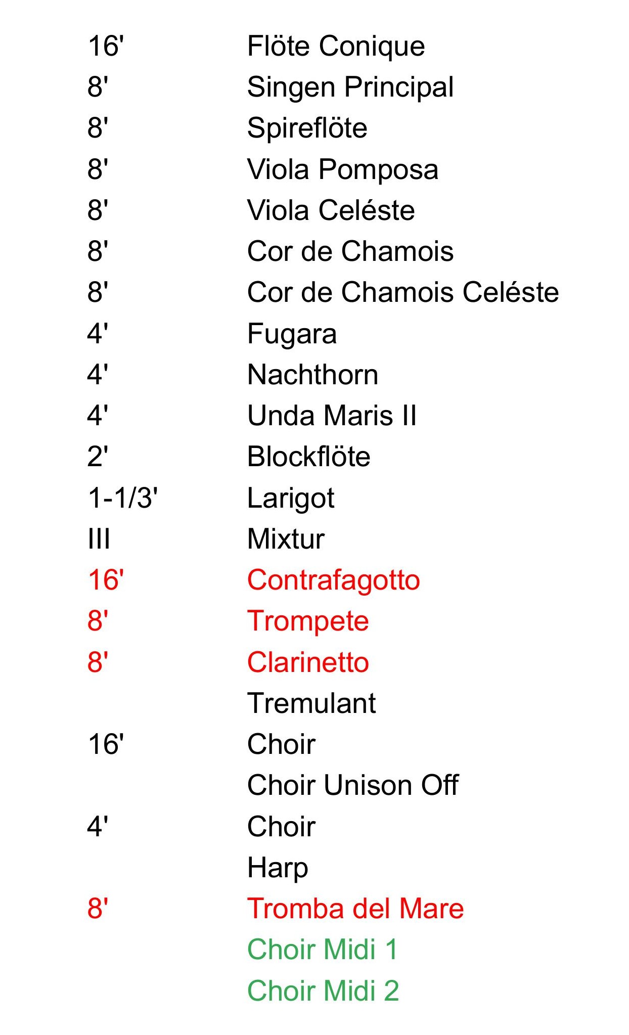 Chorale – This smaller division, located close to the choir, will accompany them when they sing alongside another organ division positioned farther away.