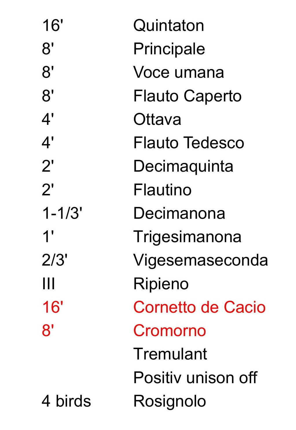 Positiv – This division functions almost as an organ within the organ and is primarily pipe-based (10 ranks). It is modeled after the Italian Baroque organs of Northern Italy, offering bright and delightful tonal colors. The Positiv is designed to create delicate, conversational contrast with the main divisions, reminiscent of the organs of the Duomo di Milano. It features a distinctive reed stop, the Cornetto de Caccio (hunting horn).